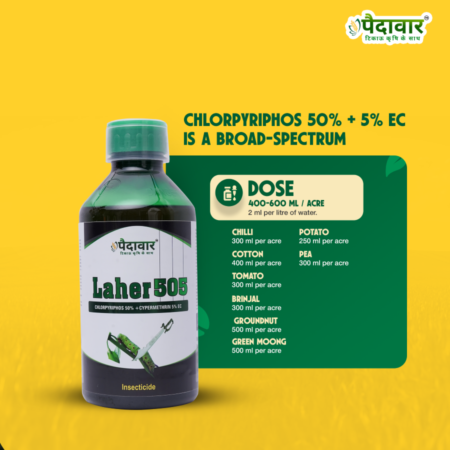 Paidavaar Laher 505 (Chlorpyriphos 50% + Cypermethrin 5% EC) is a broad-spectrum insecticide that combines the power of an organophosphate (Chlorpyriphos) and a synthetic pyrethroid (Cypermethrin). This dual-action formulation provides fast knockdown along with long-lasting control against a wide range of chewing, sucking, and soil-dwelling pests.