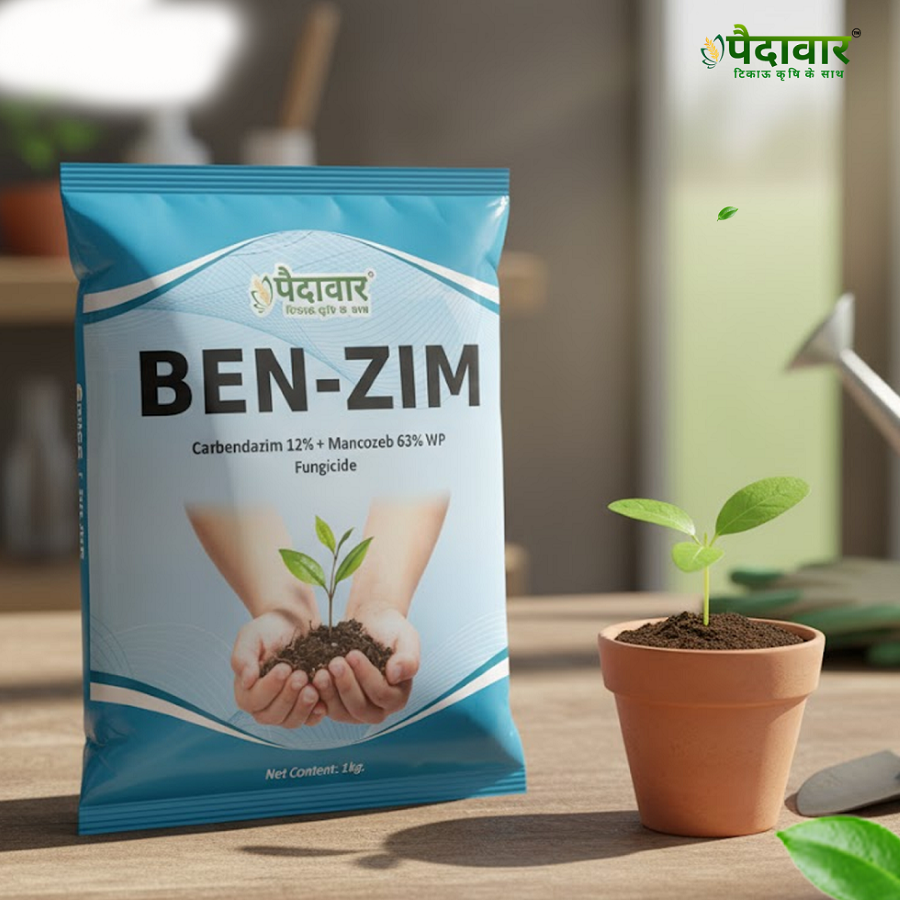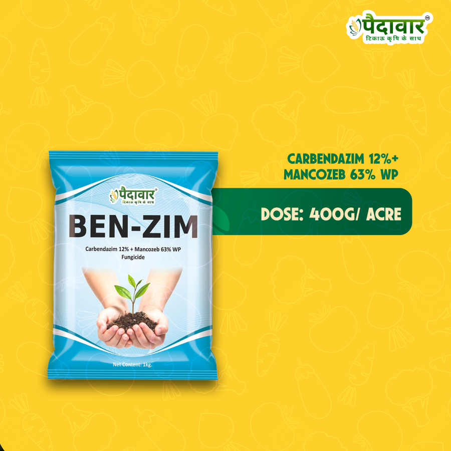 Paidavaar Ben Zim Fungicide (Carbendazim 12% + Mancozeb 63% WP) is a broad-spectrum, dual-action fungicide formulated as a wettable powder. It combines the systemic curative action of Carbendazim with the contact protective action of Mancozeb. This dual mechanism enables both preventive and curative control of major fungal diseases such as blights, leaf spots, mildews, wilts, and rusts across a wide range of crops. It supports healthier plant growth, reduces disease incidence, and enhances yield performance.