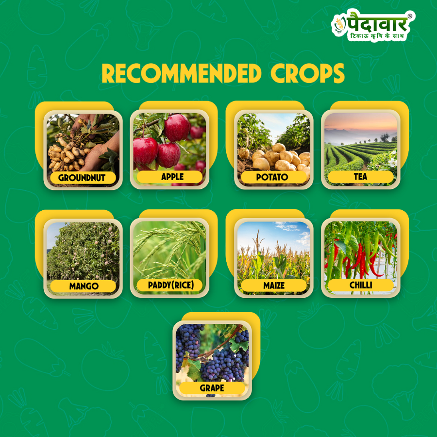 Recommended Crops: Suitable for use on paddy, potato, tea, grape, mango, chilli, maize, apple, cotton, orange, groundnut, soybean, and pea.