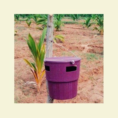 Bucket traps are specially designed and created for trapping Red Palm weevil and Rhinoceros Beetle. The trap has to be installed around the coconut tree about five feet from ground surface level and has to be fixed by pouring water along with coconut bark particle. The trap must be serviced at least once in two weeks to remove the dead beetles.