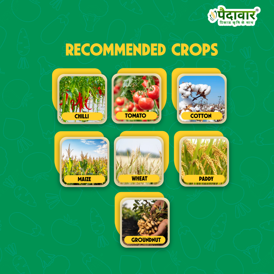 - Can be used on a wide variety of crops like grapes, chilli, tomato, cucumber, paddy, wheat, groundnut, mango, and more.