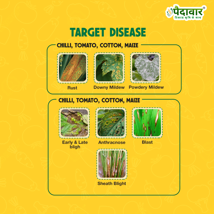 - Highly effective against a wide range of fungal diseases such as early and late blight, powdery mildew, downy mildew, rust, leaf spots, and anthracnose.