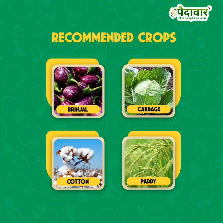 Targeted Pests: Aphid, Jassids, Thrips, Whitefly, Fruits and Shoot borer, American bollworm, Spotted bollworm, Pink bollworm.