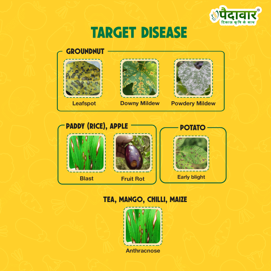Targeted Diseases: Effective against collar rot, fusarium wilt, anthracnose, alternaria leaf spot, myrothecium leaf spot, pod and stem blight, fruit scab, powdery mildew, downy mildew, leaf spot complex, fruit rot, blister blight, grey blight, red rust, die-back, black rot, and black scruff.