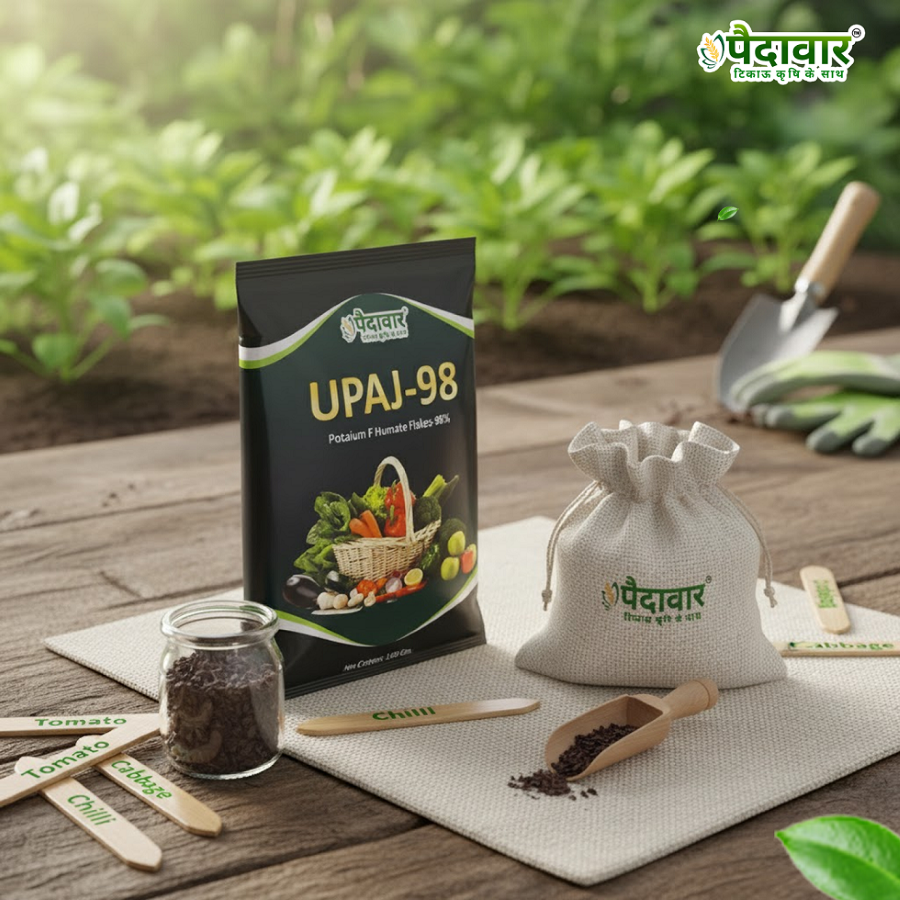 Paidavaar Upaj-98 Fertilizer Potassium Humate 98% Flakes is a premium grade, water soluble organic soil conditioner and plant growth enhancer derived from high quality leonardite. Packed with humic acid, fulvic acid, seaweed extract, nitrogen, and enzymes, it works to enrich soil structure, stimulate enzyme activity, and promote the growth of beneficial microorganisms like yeast and algae. These shiny black flakes ensure rapid nutrient absorption, improve root development, and boost crop yield while enhancing resistance to environmental stress. Ideal for use through foliar spray, drip irrigation, or direct soil application, it supports healthy, vigorous growth in a wide variety of crops.