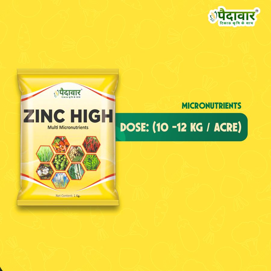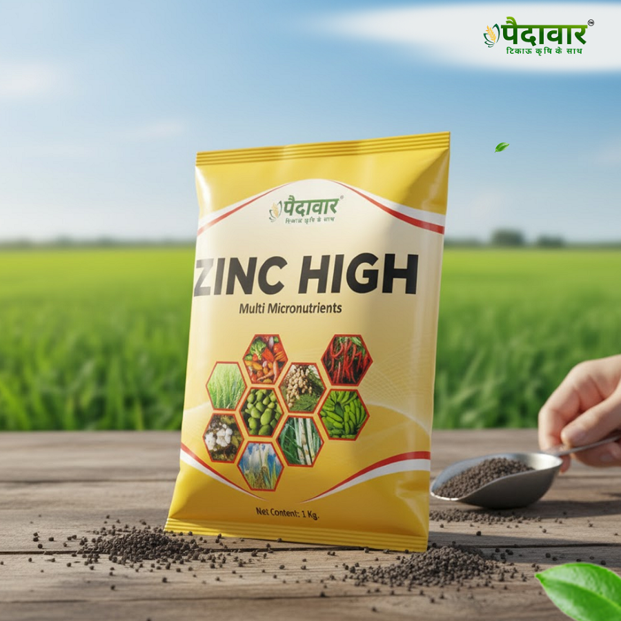 Paidavaar Zinc High is a balanced multi micronutrient fertilizer, formulation designed to correct and prevent multiple nutrient deficiencies in crops. It contains an ideal blend of essential micronutrients, including Zinc (5%), Iron (2%), Boron (0.5%), Magnesium (0.5%), and Copper (0.2%). This combination improves plant metabolism, chlorophyll formation, enzyme activation, and reproductive growth. Regular application of Zinc High enhances flowering, fruit setting, yield quality, and overall crop productivity, ensuring healthy and vigorous plant growth.